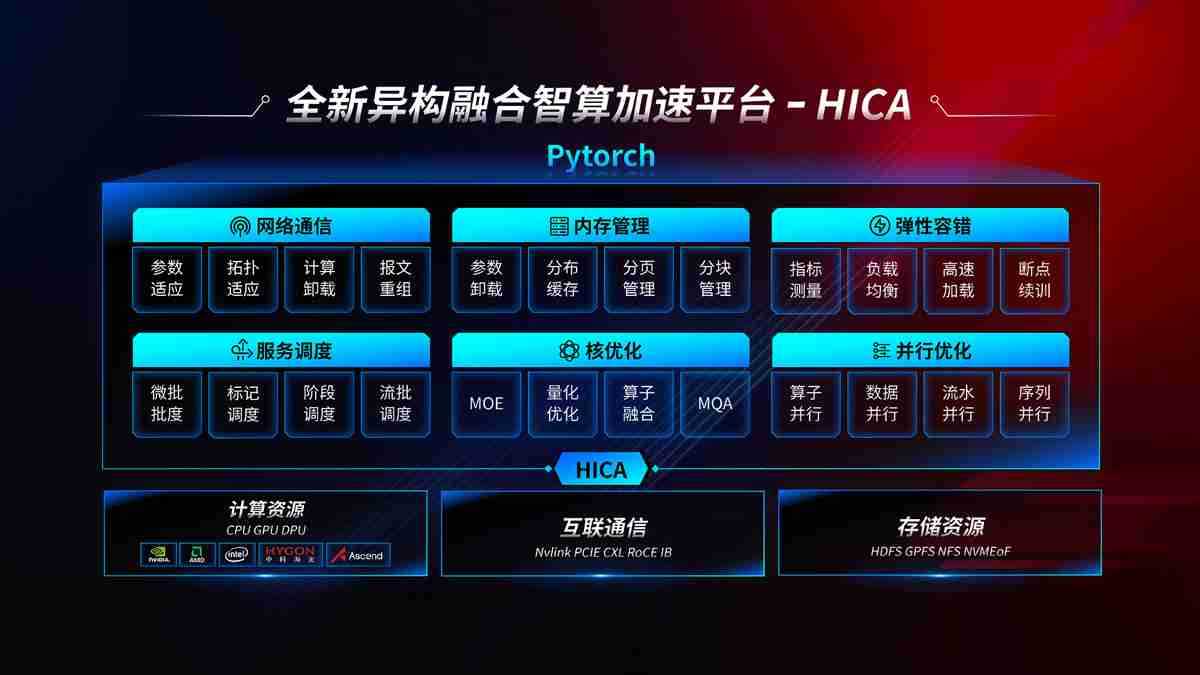 通过自研的服务层、、、中间适配层、、、以及调度编排算法,,采用数据并行、、模型并行等多种并行方式,,把并行计算任务进行有效的分解,,,使其分别由相应的软件栈和算力资源来承接。。。。当GPU资源变化,,,HICA可以实时动态调度计算子任务并调整模型拓扑和架构,,以充分聚合各种算力资源。。。。
