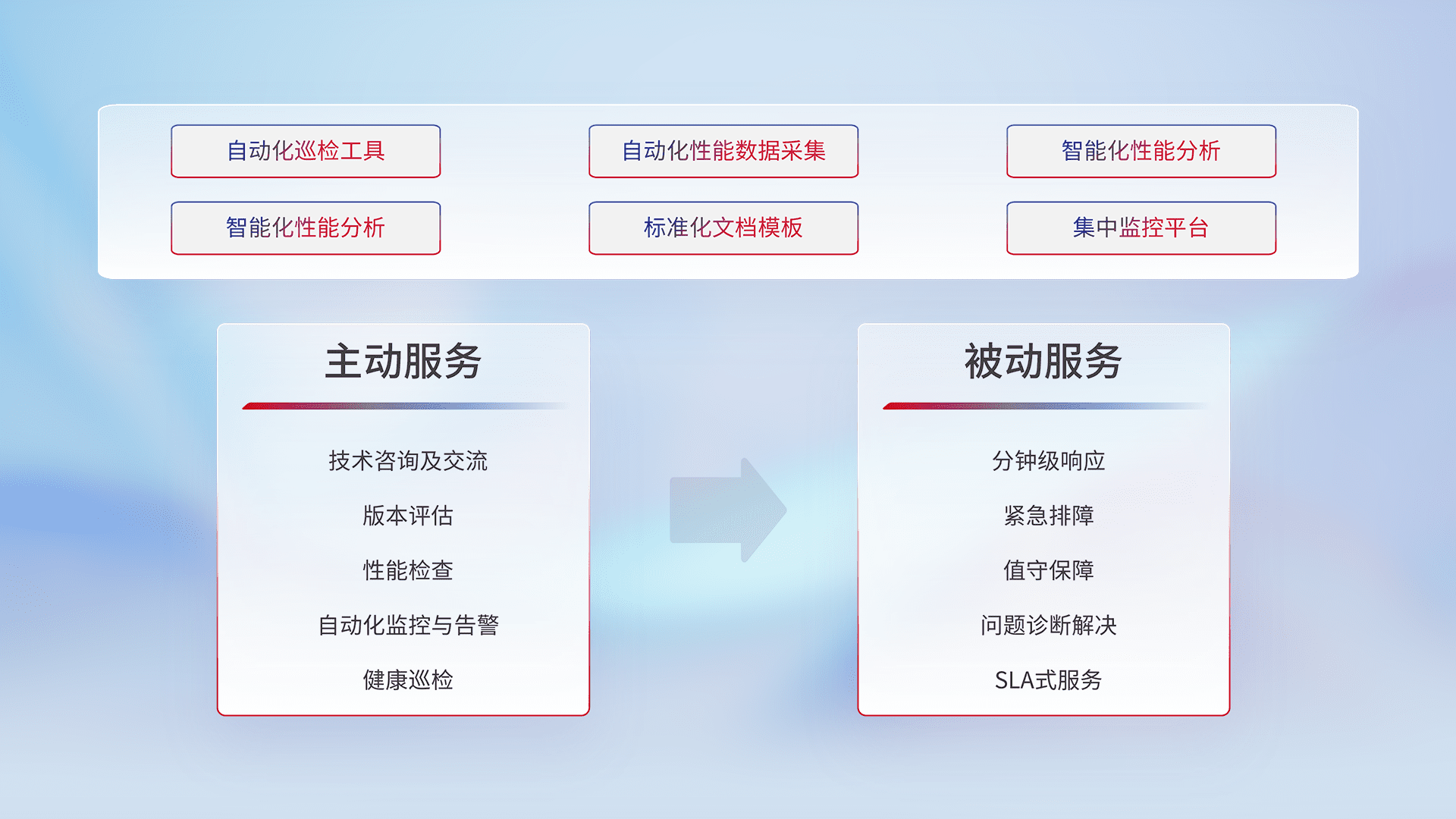 智能化工具和标准化文档,,保障服务质量,,,提供主动服务(包含技术咨询、、、、版本评估、、、、性能检查、、自动化监控与告警、、、健康巡检)和被动服务包含(分钟级响应、、、紧急排障、、、、值守保障、、、问题诊断解决、、SLA服务)。。。
