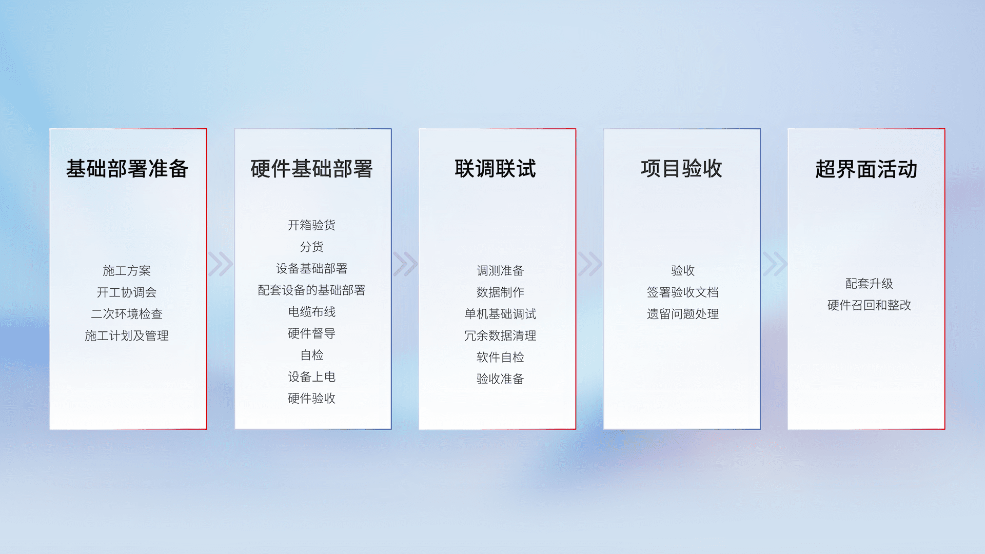 从基础部署准备、、、、硬件基础部署、、联调联试、、项目验收、、越界面活动的全过程可追溯,,,保证施工质量和进度。。。